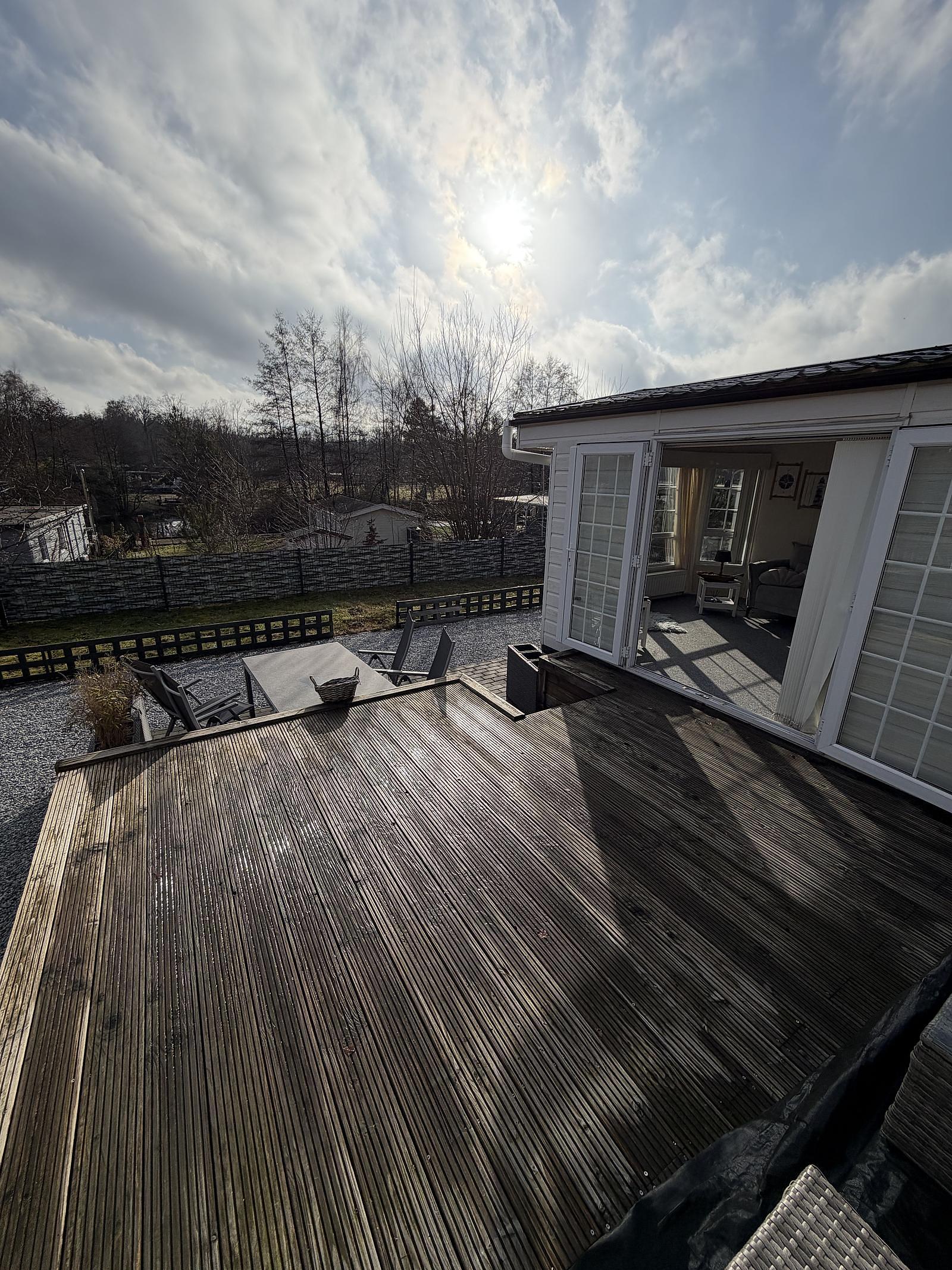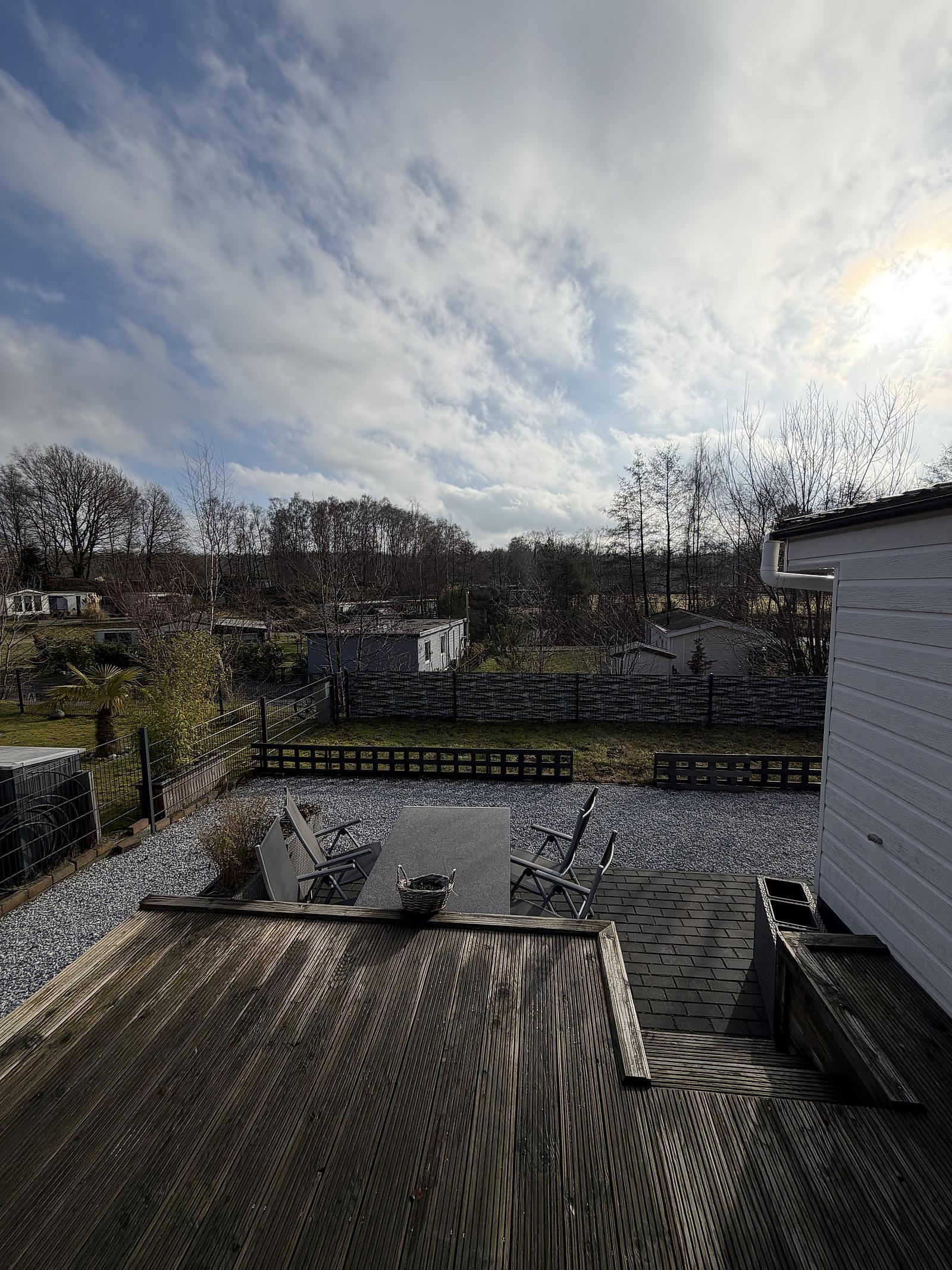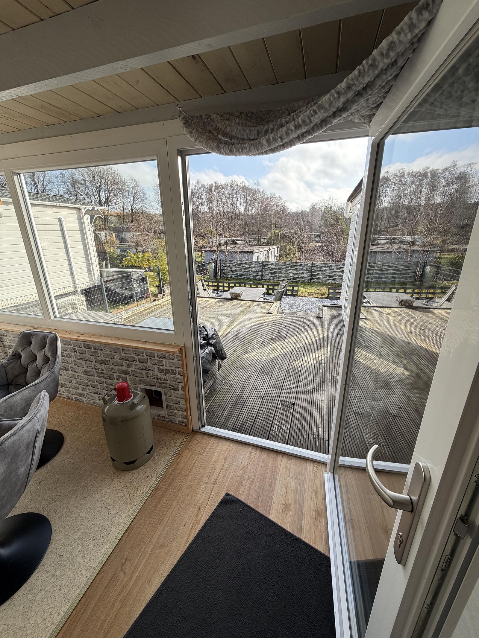 Gut gepflegter L-förmiger Mobilheim mit großer Terrasse und freiem Blick