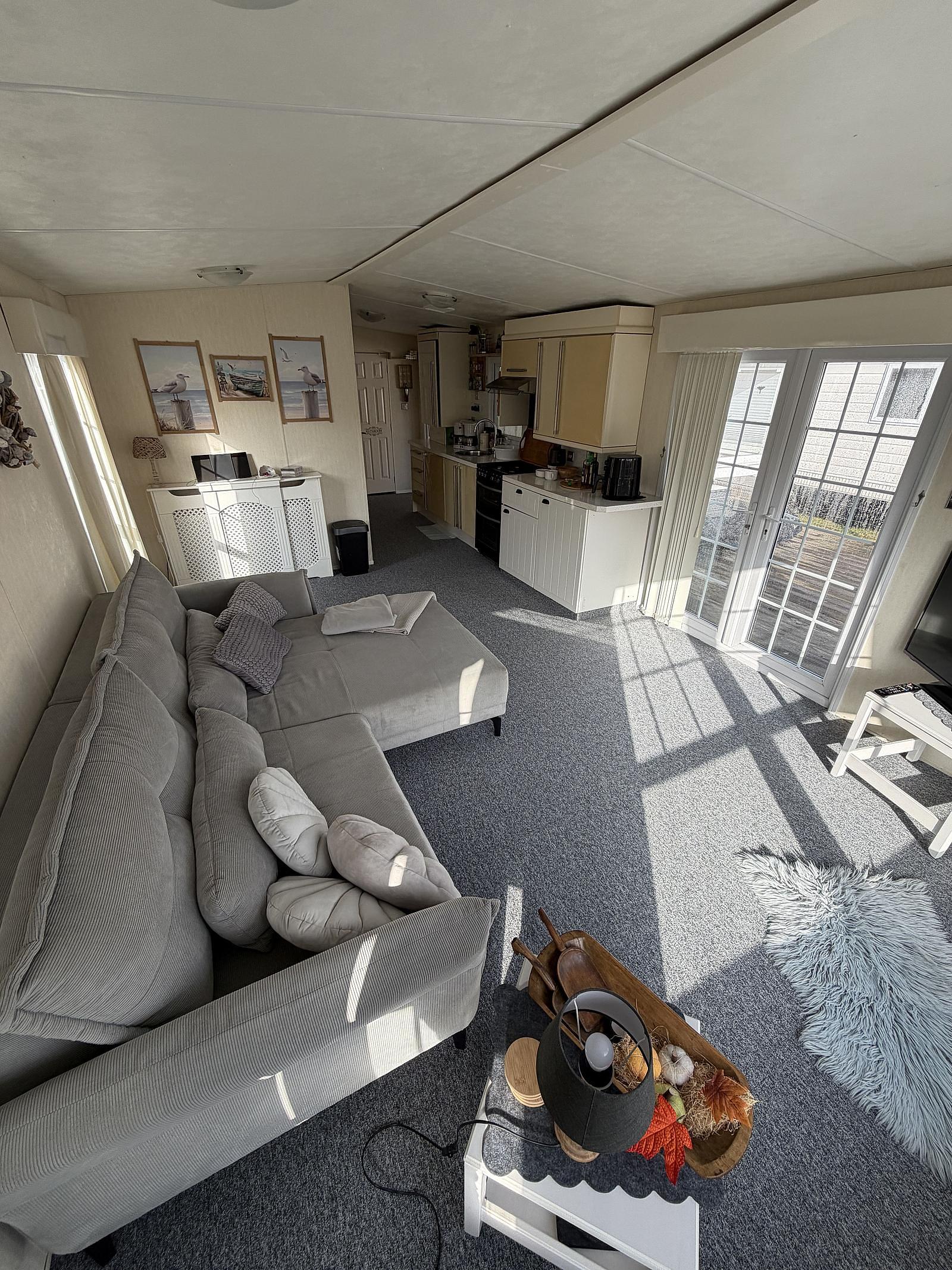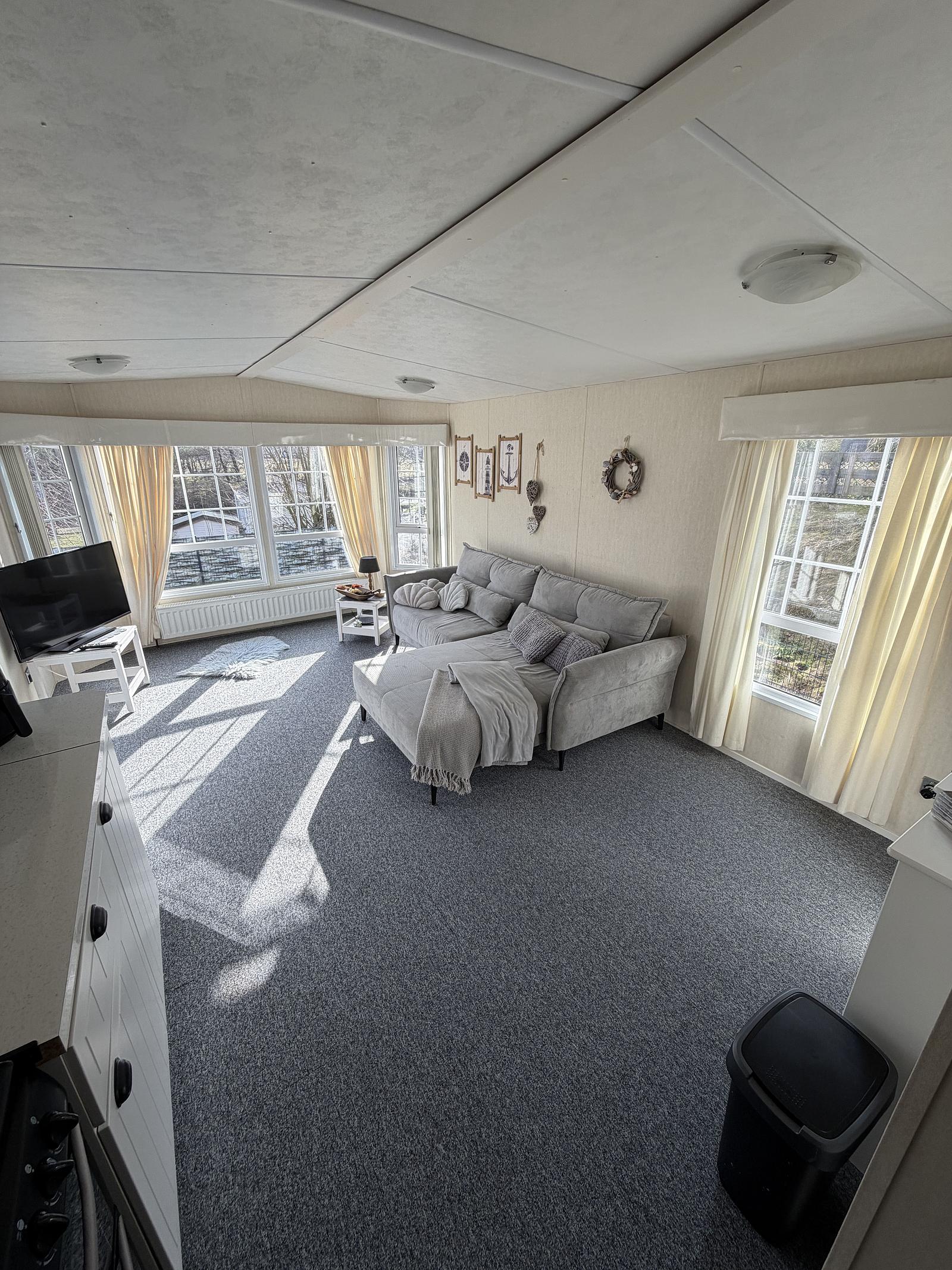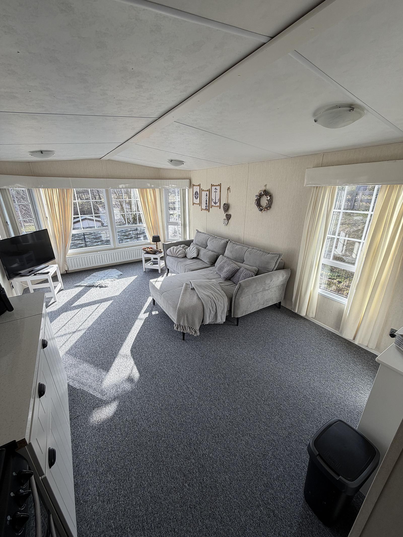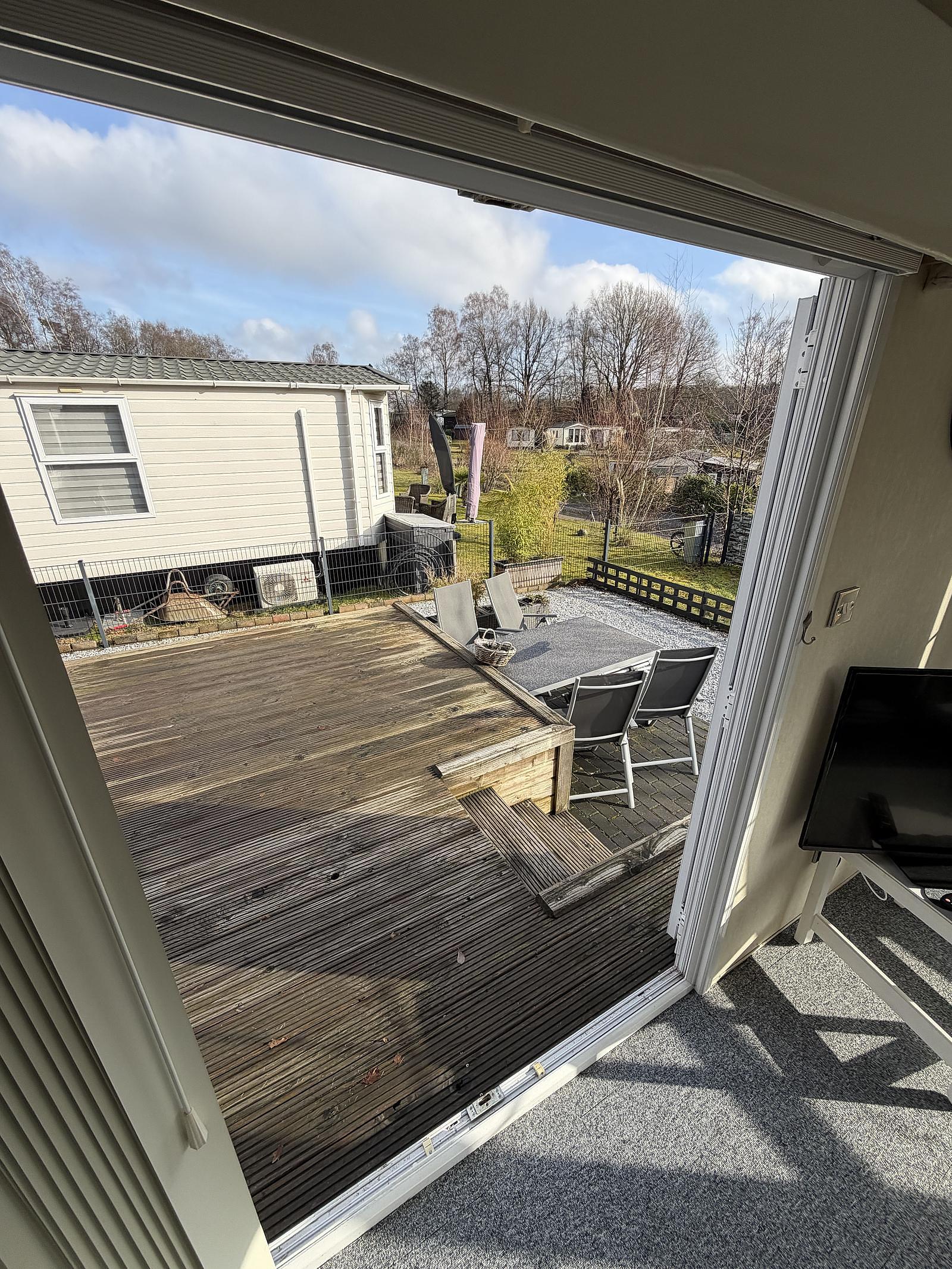 Gut gepflegter L-förmiger Mobilheim mit großer Terrasse und freiem Blick