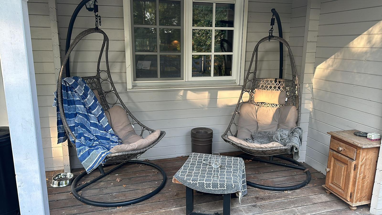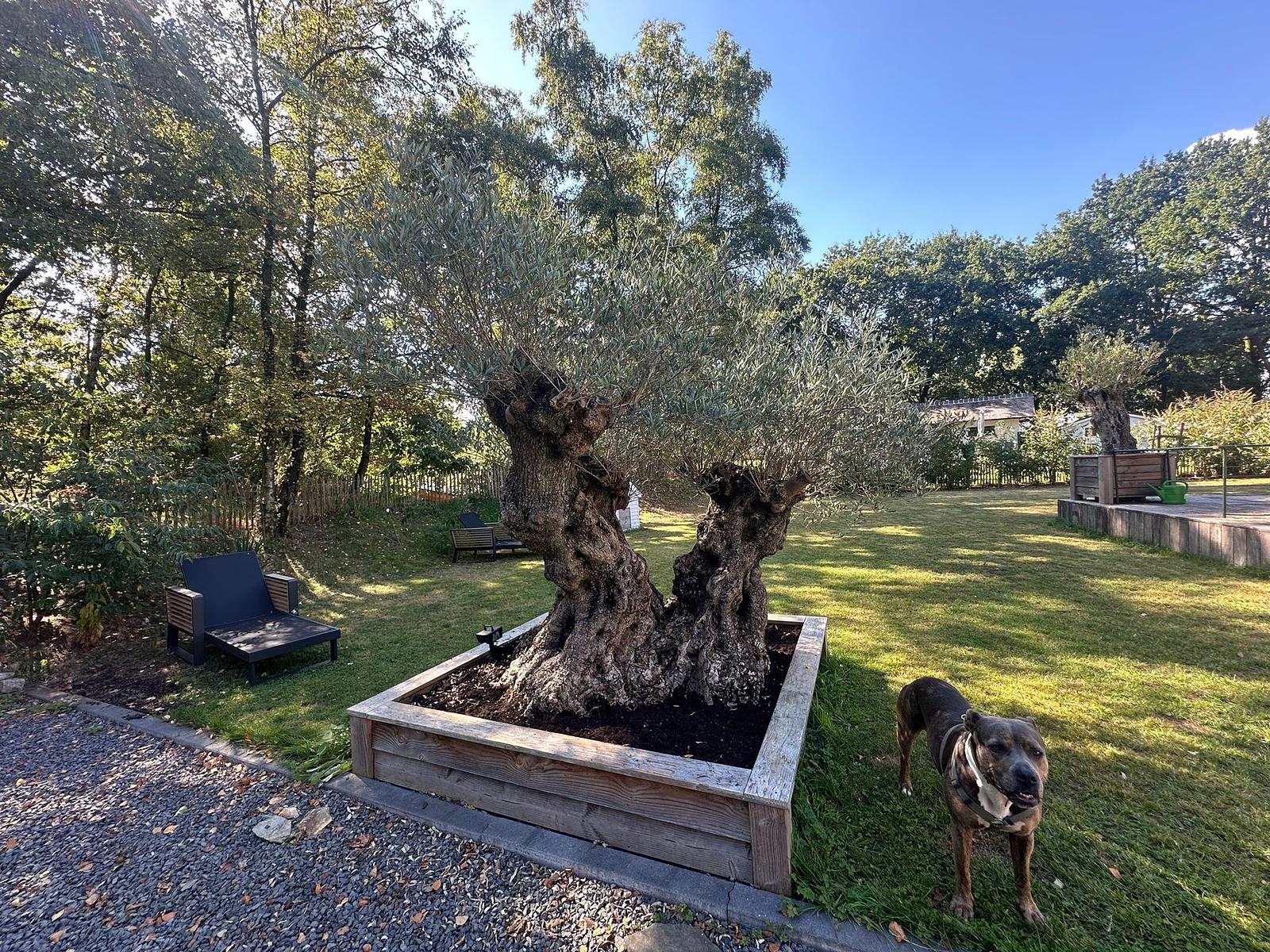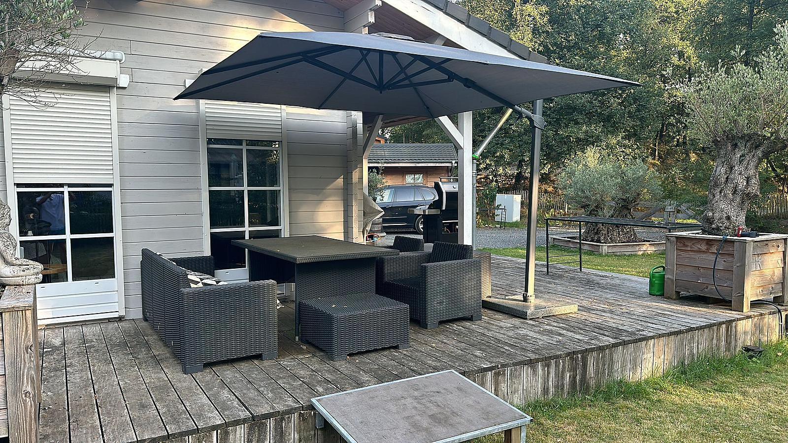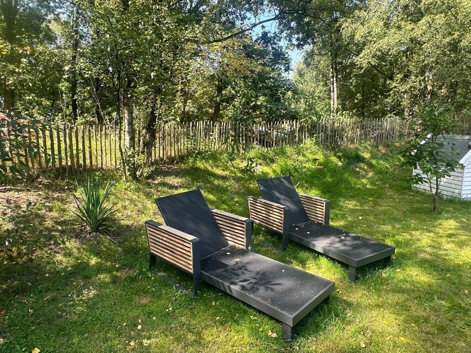 De tuin is ruim, groen en volledig omheind (hondvriendelijk), met meerdere overdekte zitplekken.