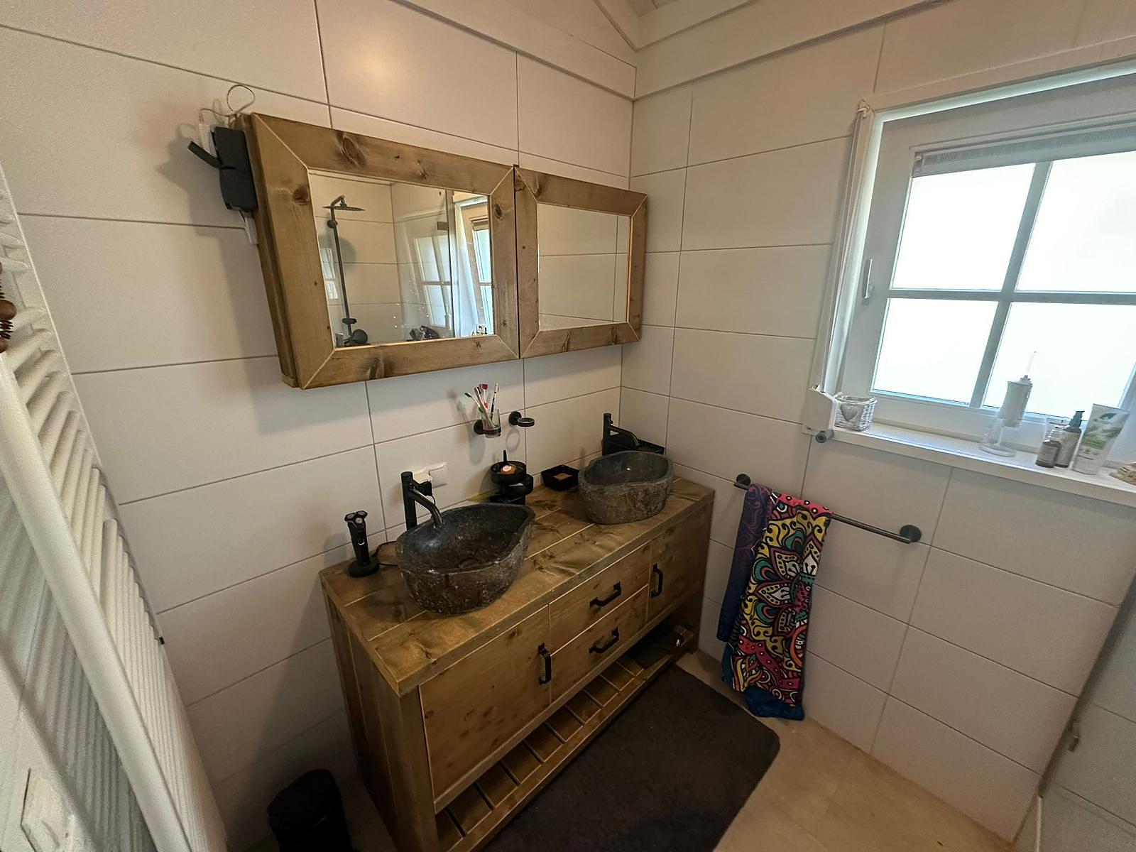 Complete badkamer met douche en wastafel.