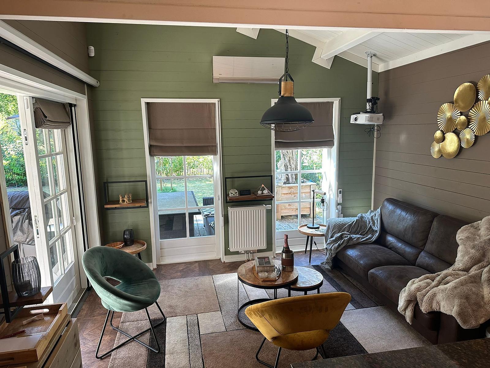 Sfeervolle woonkamer met home cinema (Apple projector + rolscherm).